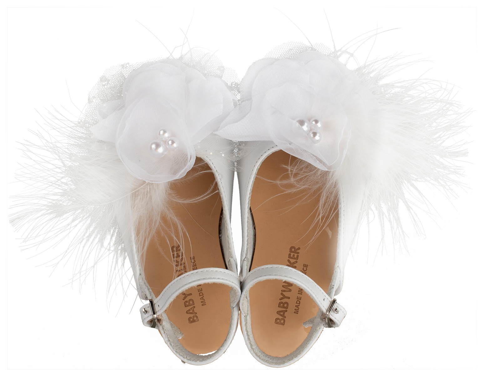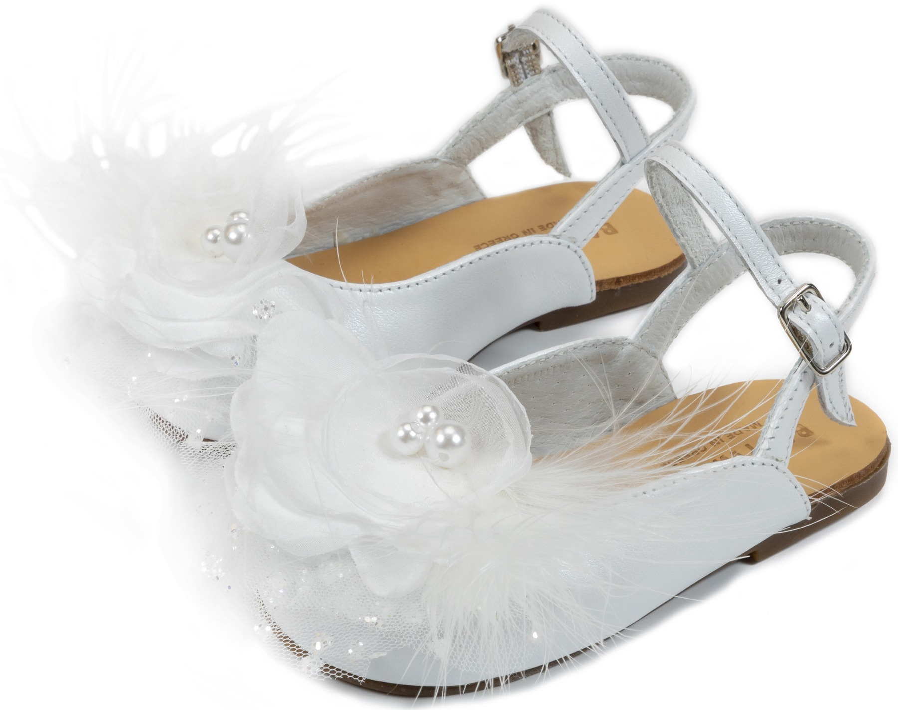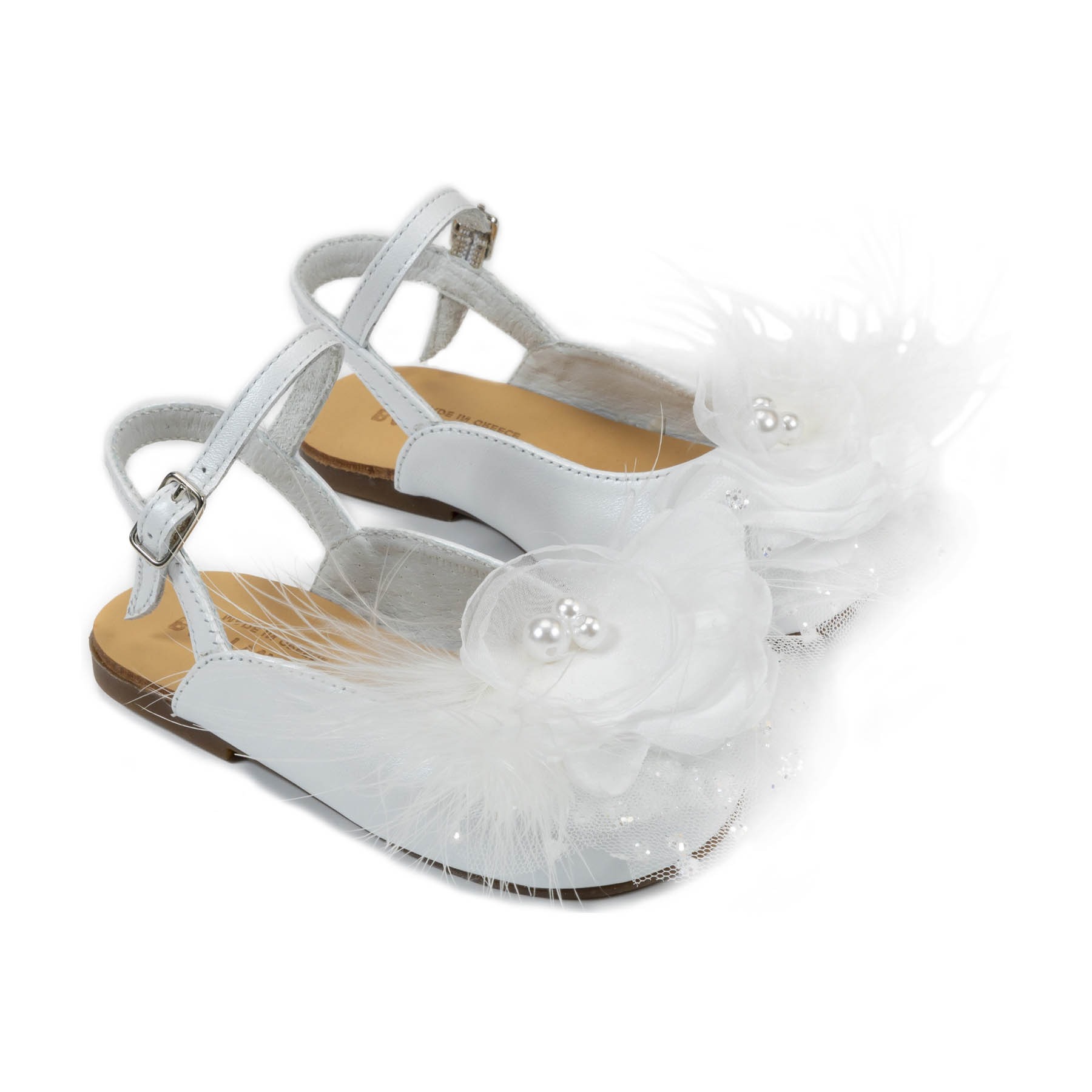 Δερμάτινο Σαμπό Διακοσμημένο με Χειροποίητο Chiffon Λουλούδι και Πούπουλα από Δέρμα Πέρλα σε λευκό Χρώμα