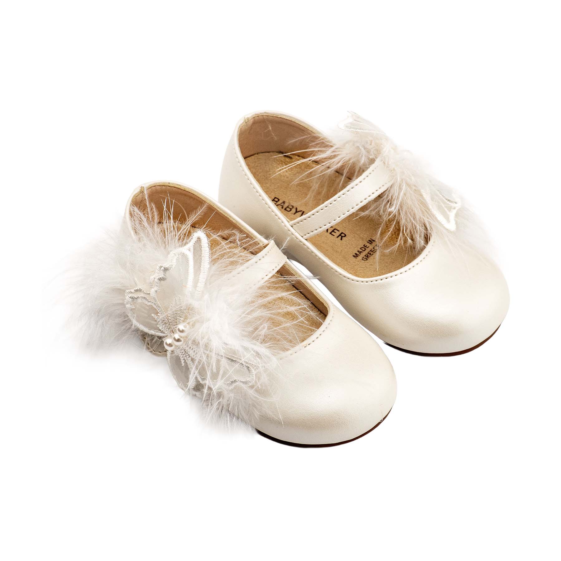 Δερμάτινο Γοβάκι Μονή Μπαρέτα με Χειροποίητο Διακοσμητικό Πεταλούδα και Πούπουλα σε Εκρού Χρώμα